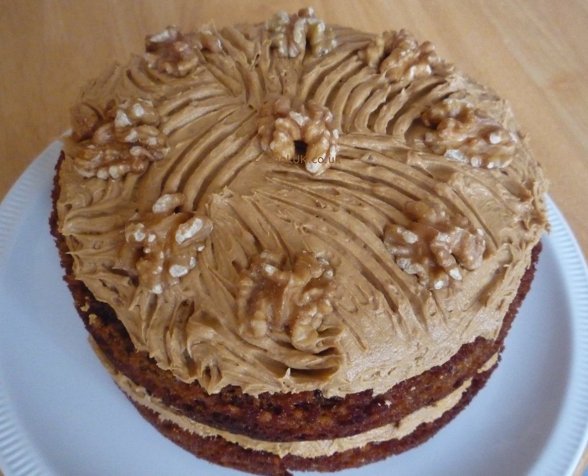 Spread half the butter icing evenly over the top of one sponge, place the other sponge on top of it. Now use the remaining butter icing to cover the top of the cake. Use a fork to draw a few patterns on top of the icing. Add the remaining walnut halves onto the top of the icing.