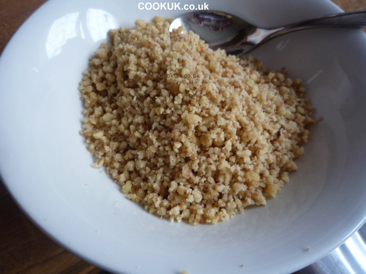 Pour the walnuts for the cake mixture into your food processor and whizz them round for thirty seconds or so until they are the size shown in the picture. Place them in a bowl for use later on.