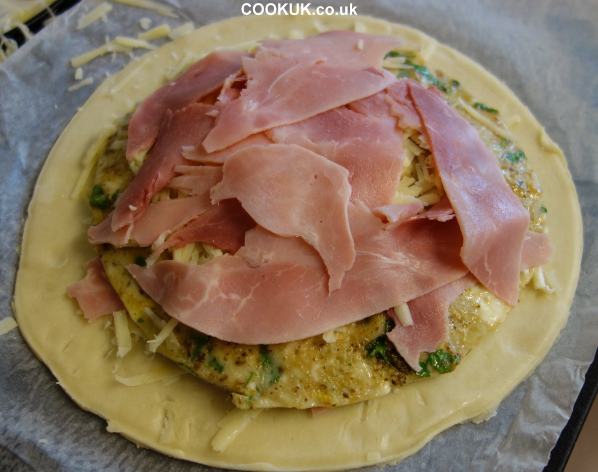 Now place one of the omelettes onto the pastry followed by a third of the grated cheese and ham. Repeat the omelette, cheese and ham layers twice more.