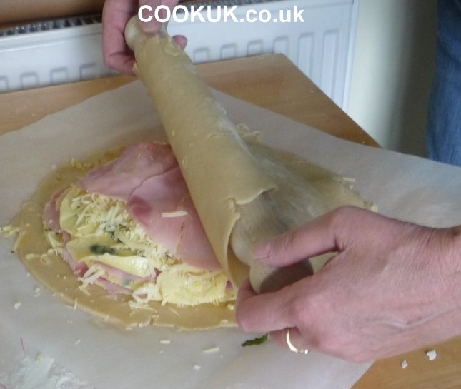 Lay the rolled up pastry over the filling by unrolling it from the rolling pin.