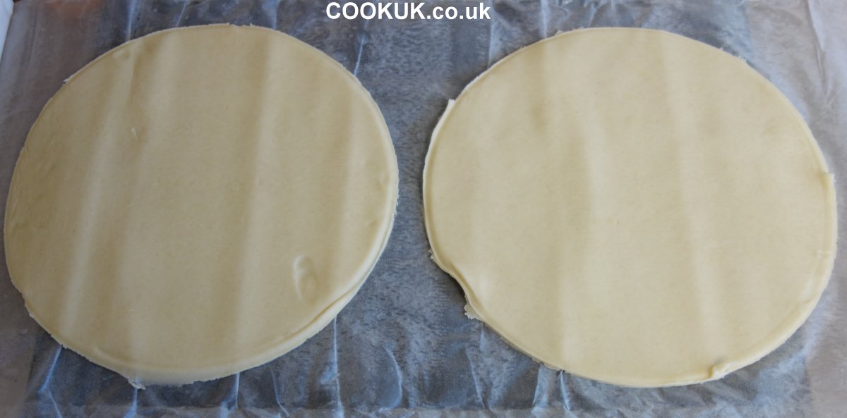 STEP 3You will need to cut out two 25cm / 10in diameter circles of pastry, one for the base and one for the top. That measuremnt is approximate, slightly smaller or larger is no problem. Keep the top and bottom layers on separate plates. If you layer them together at this point, they may be difficult to separate.