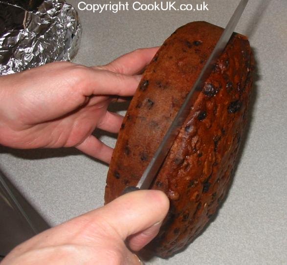 Liberally sprinkle the cut side with brandy or port (roughly 30 ml / 1 fluid ounce). This will preserve the cake and add to the taste.