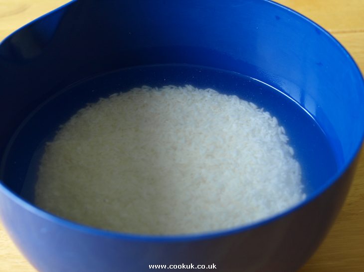 Wash the rice several times in cool water until the water becomes clear of starch. Place the washed rice in a large bowl of water and leave to soak for 30 minutes. Drain the rice and rinse one more time to clear the remaining starch. Leave the rice to drain for five minutes.