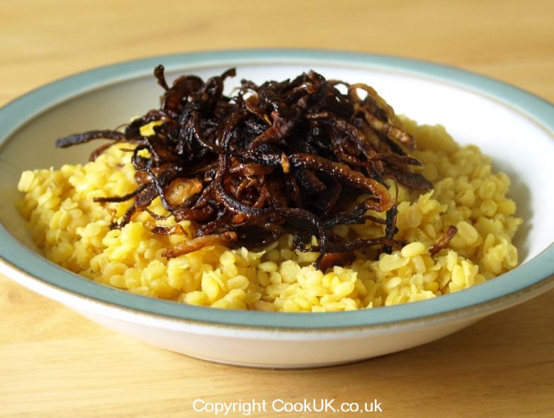 A simple dish of cooked red and yellow lentils made extra special by topping them with hot and crispy onions. Superb as an accompaniment to almost any meat dish. Surprisingly tasty on its own.