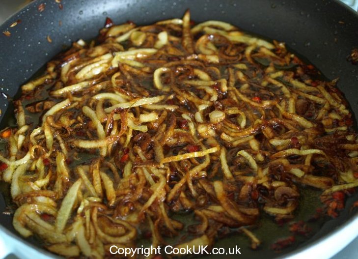 The onions will be brown and crispy after about 15 minutes. While they are cooking, mix and turn them very frequently. If they start to burn, rather than brown, turn down the heat slightly.