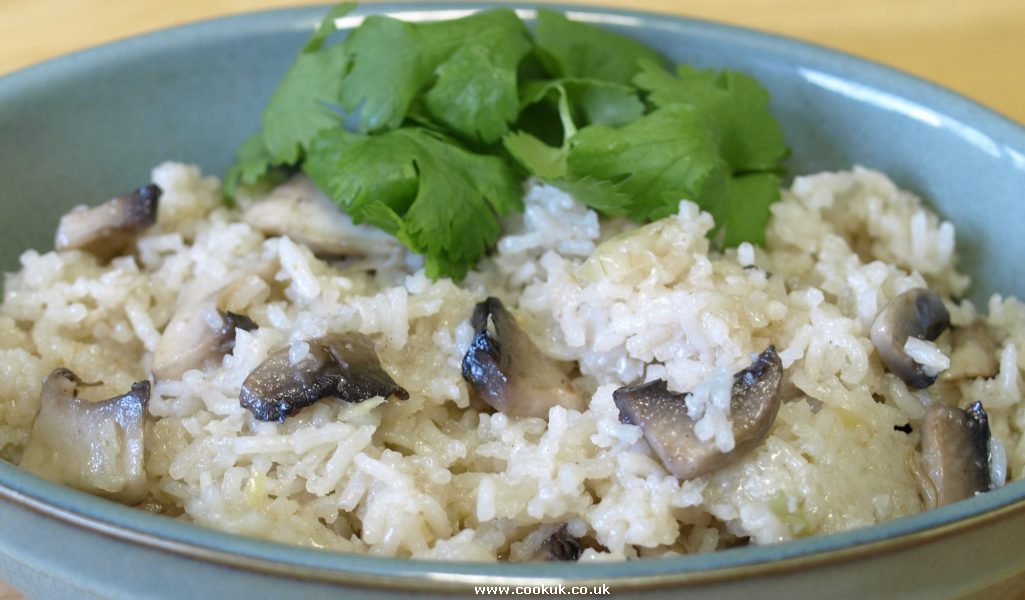 The rice is fried in oil before being boiled and steamed. Garlic and garam masala add