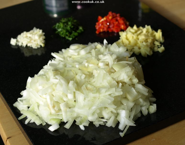 Peel, top and tail then onions then chop them finely.