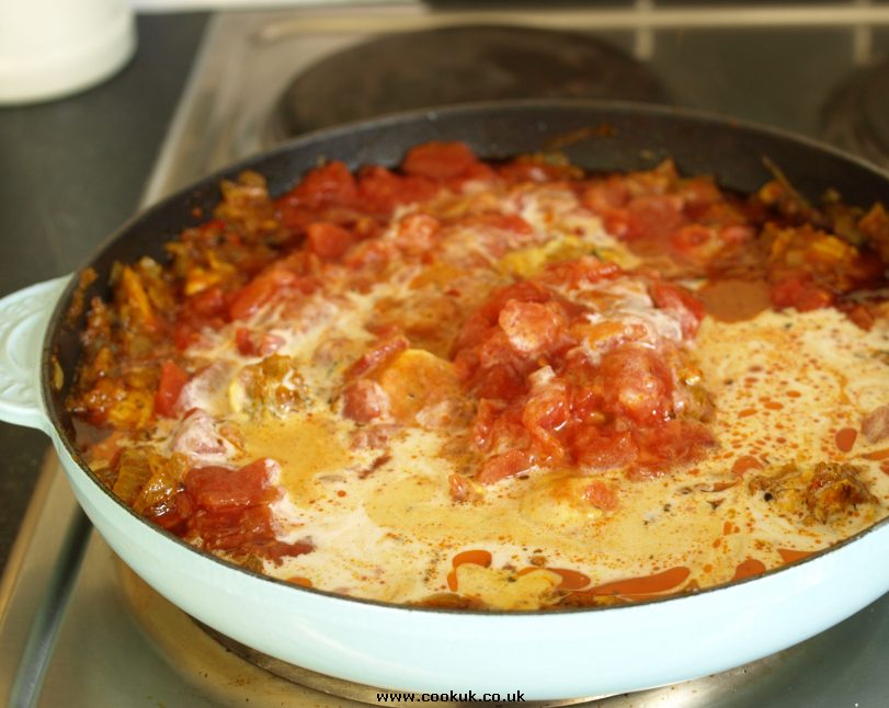 spread. This will take about 5 minutes. Add the coconut milk, tomatoes, coriander, salt