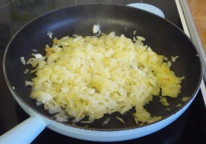 Pour the olive oil into your frying pan on a medium heat and add the chopped onions.