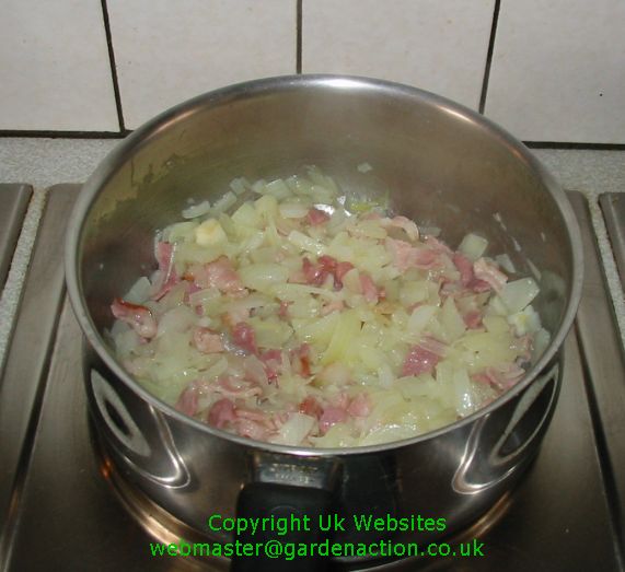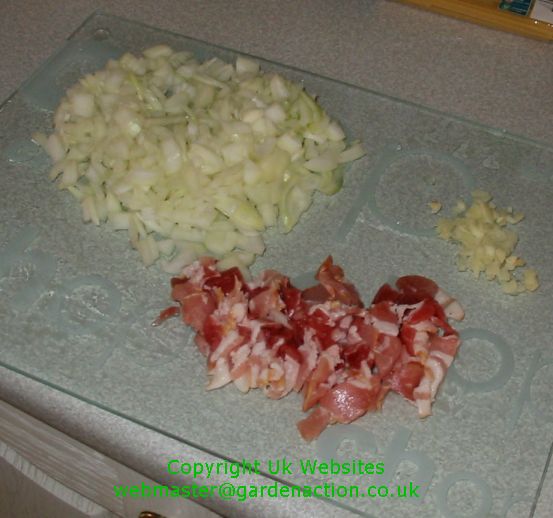 to take all the ingredients. Add the onion, garlic and bacon and