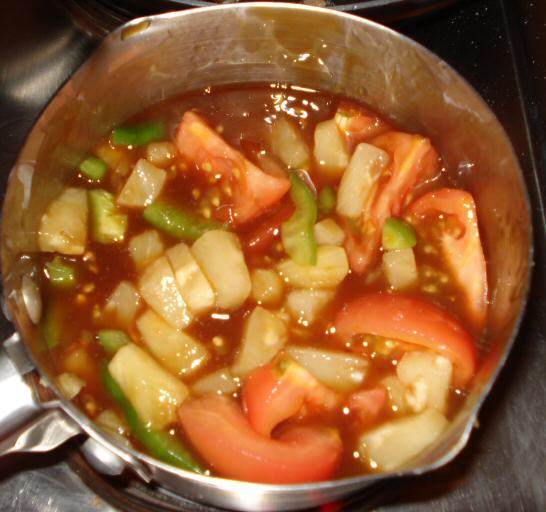 Add the green peppers, tomatoes and tinned pineapple, mix well together