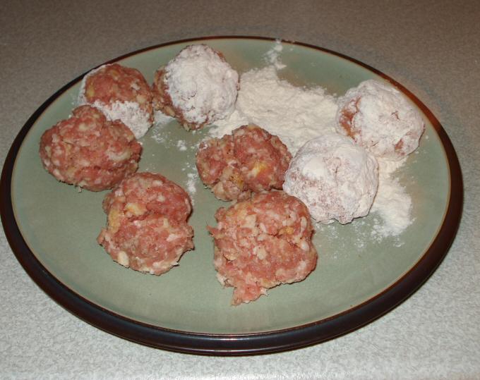 Form the mixture into 24 pork balls, then roll them in the rest of the flour,