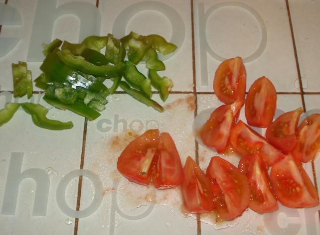 Slice the green pepper thinly, skin the tomatoes by putting them in